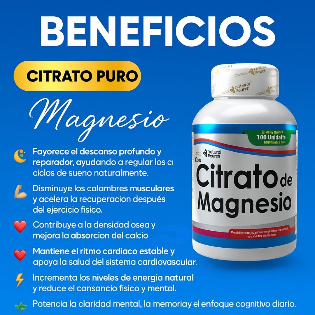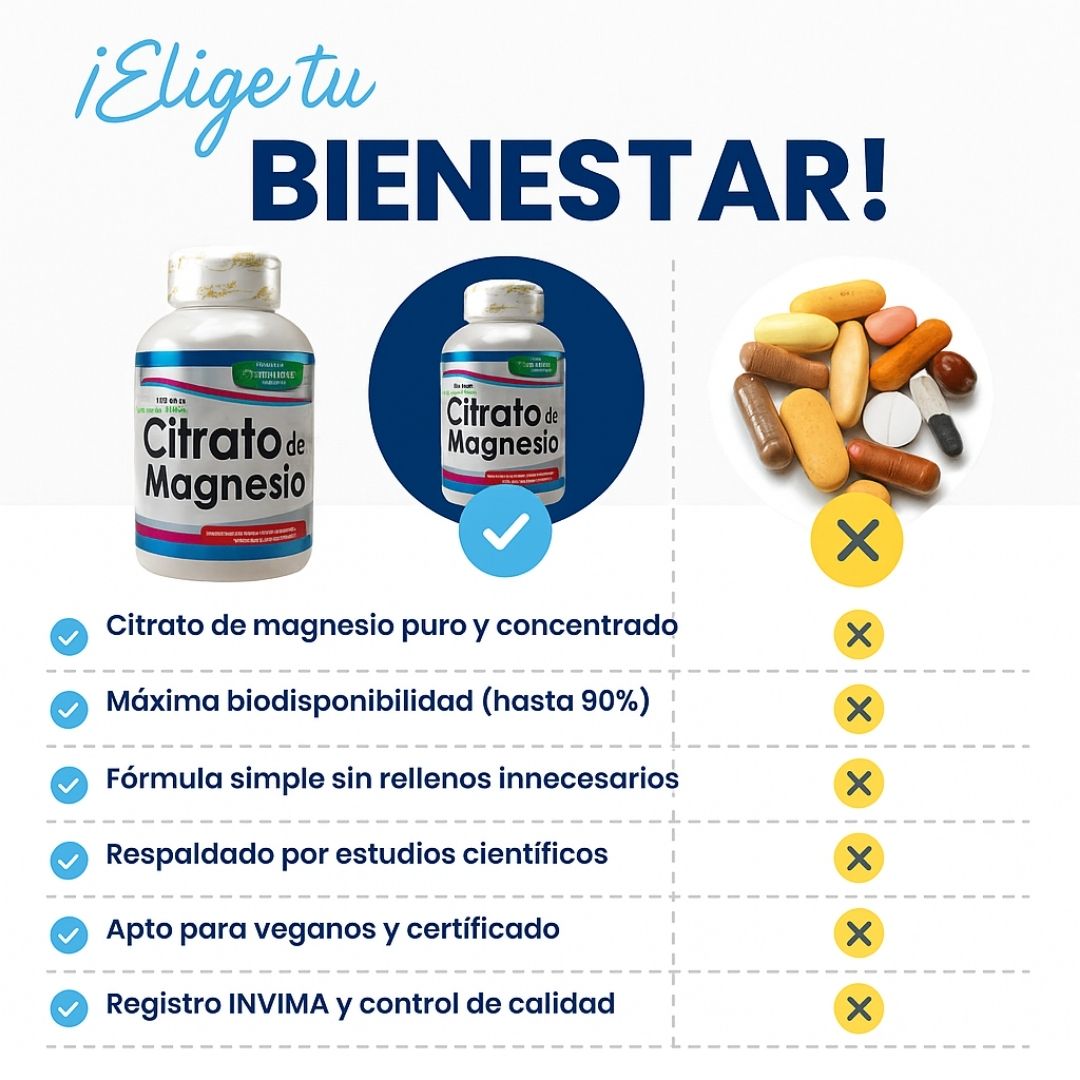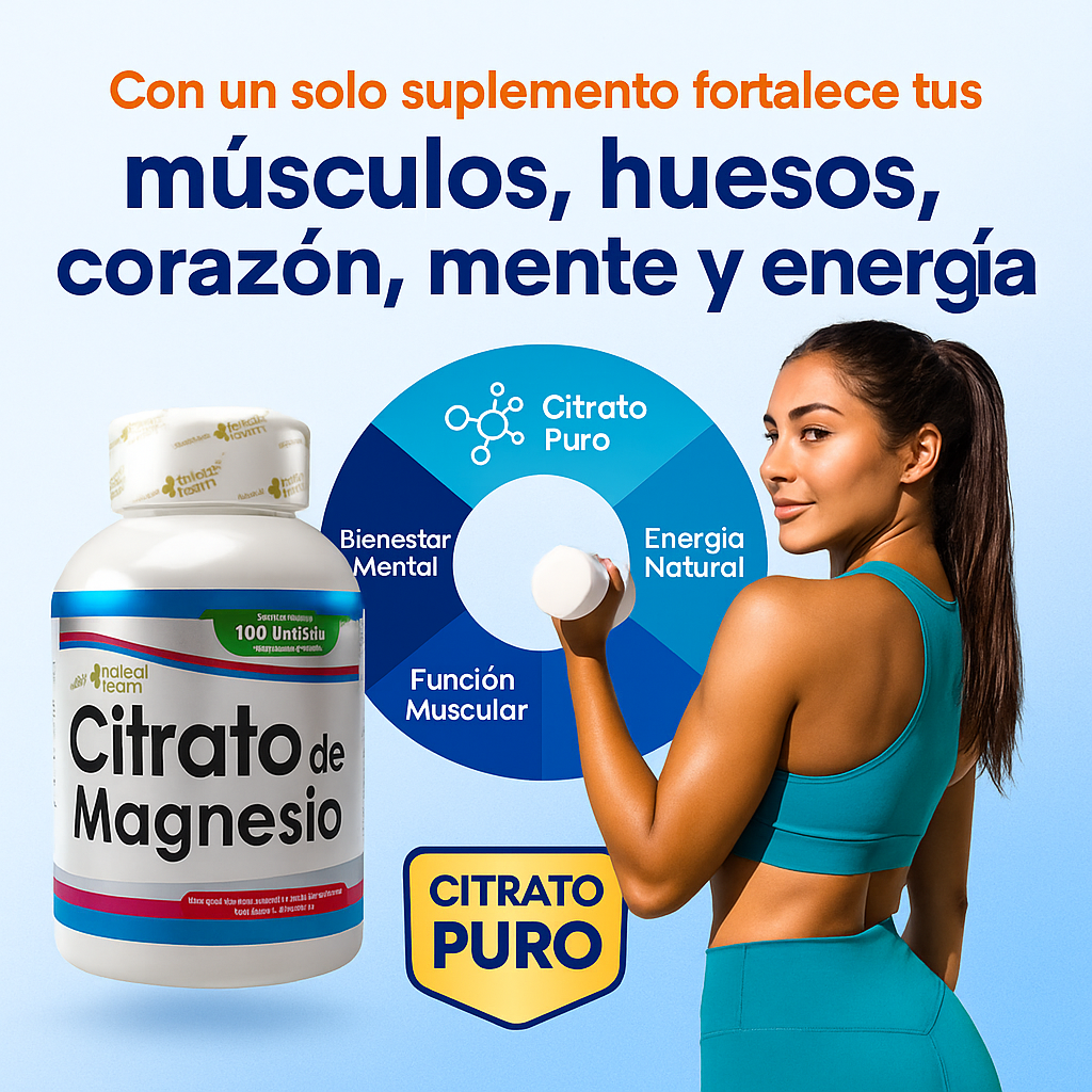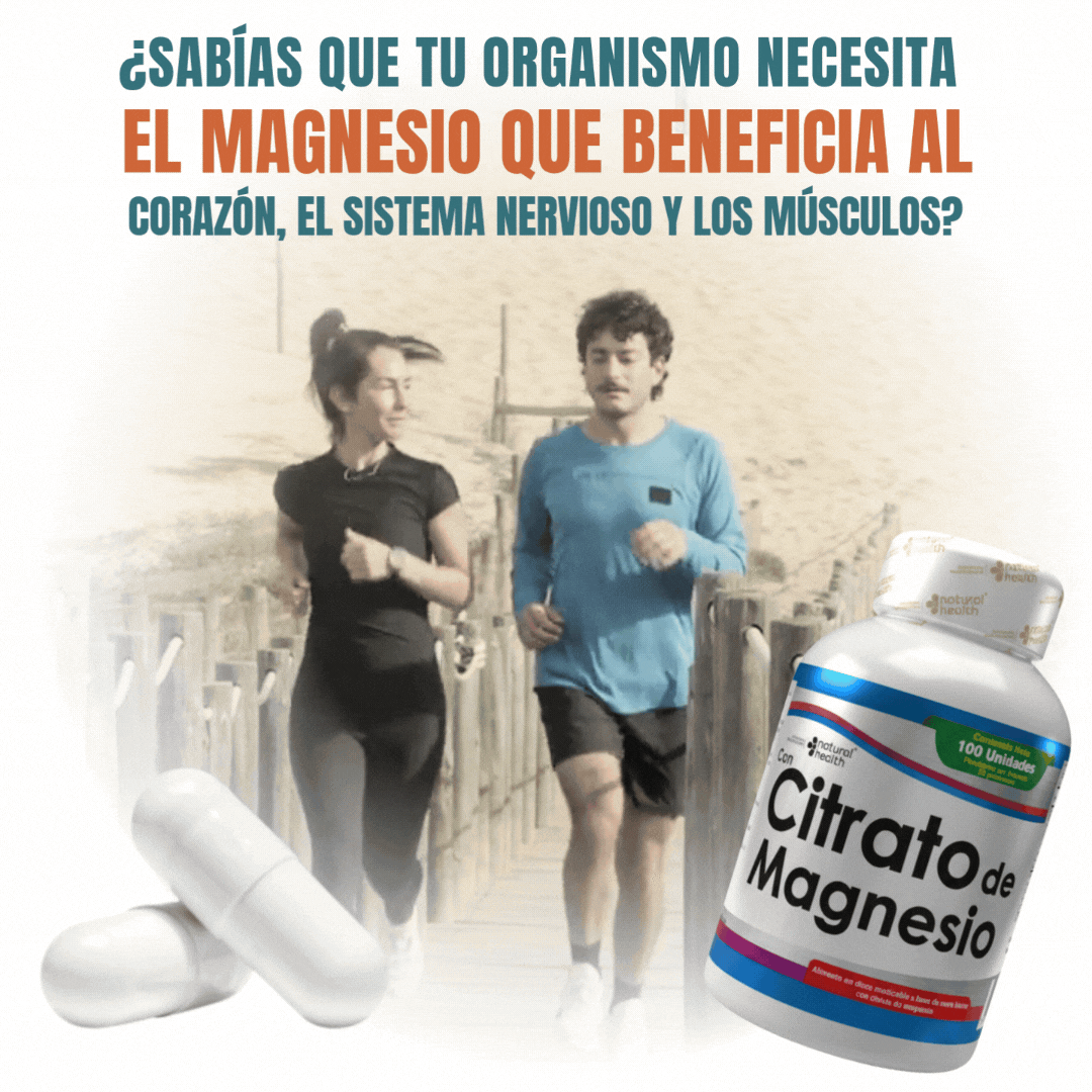 CITRATO DE MAGNESIO Natural Health te ofrece lo que realmente importa: máxima absorción y pureza garantizada. Con 40% de citrato concentrado, cada dosis trabaja eficientemente en más de 300 procesos vitales de tu organismo. No necesitas combinaciones complicadas que diluyen la efectividad. 100 unidades de magnesio que tu cuerpo absorbe, utiliza y agradece desde el primer día. Calidad sobre cantidad. Resultados sobre promesas. ✨