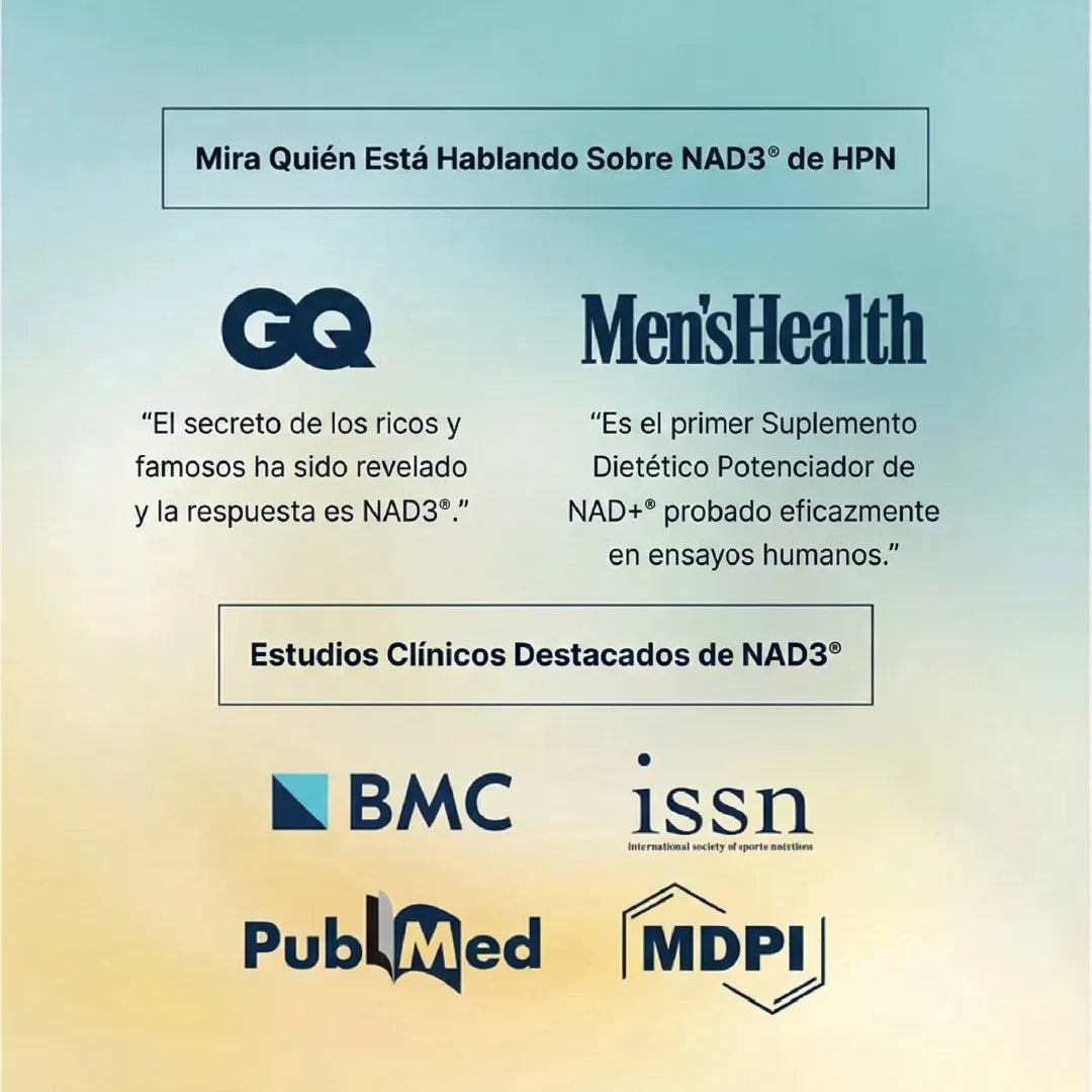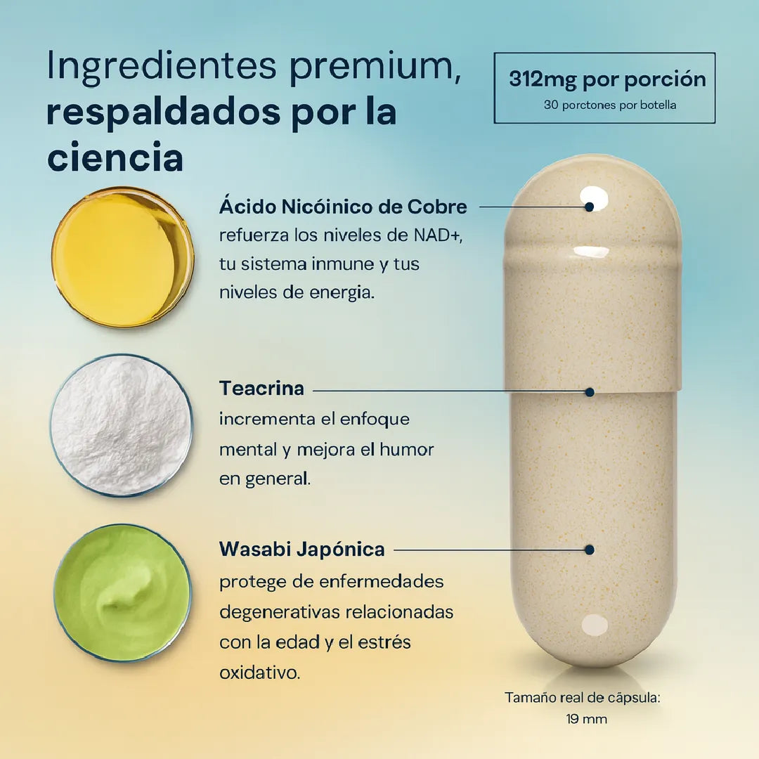 Aumenta tus niveles de NAD+ dentro de las 24 horas posteriores a la toma de NAD3. ¡Te dará energía todo el día! Descubre cómo NAD3 es un potenciador superior de NAD+®.